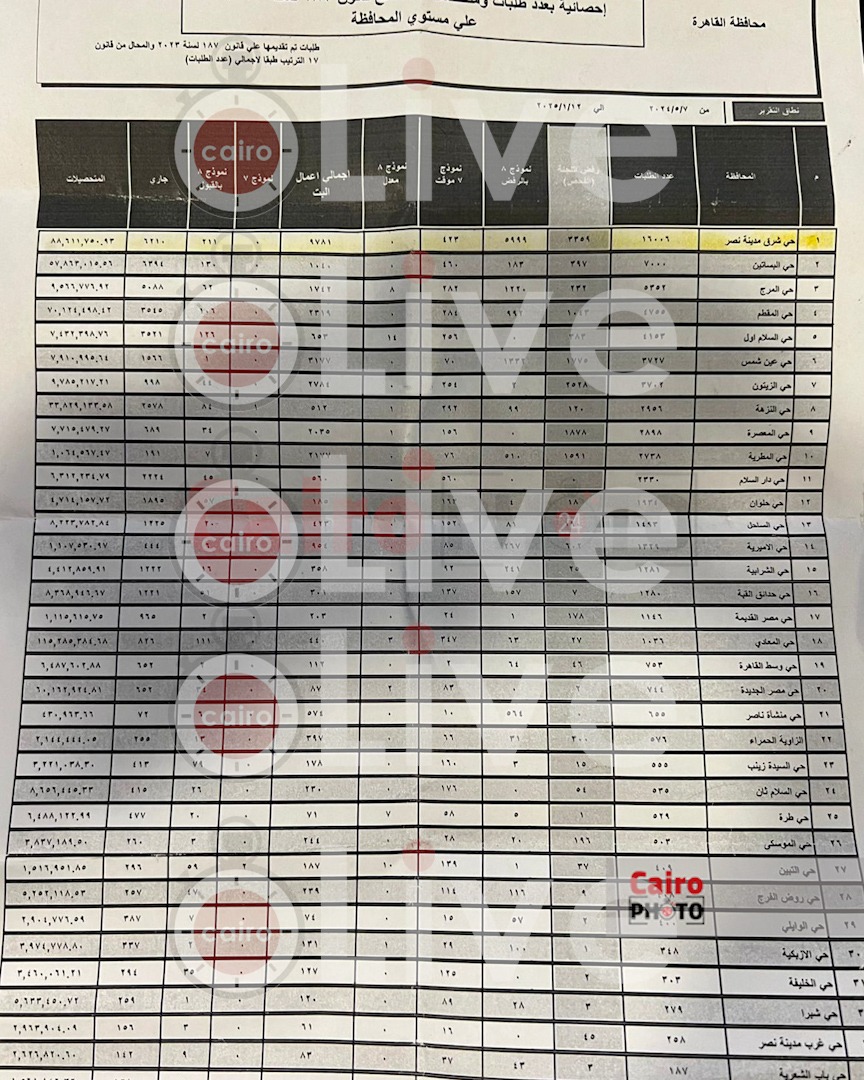 ووفقًا لمستند حصل القاهرة 24، على نسخة منه، يفيد بإحصائية رسمية لعدد طلبات التصالح المقدمة من المواطنين والمتحصلات للمبالغ المالية على مخالفات البناء بقانون التصالح رقم 187 لسنة 2023 على مستوى محافظة القاهرة.