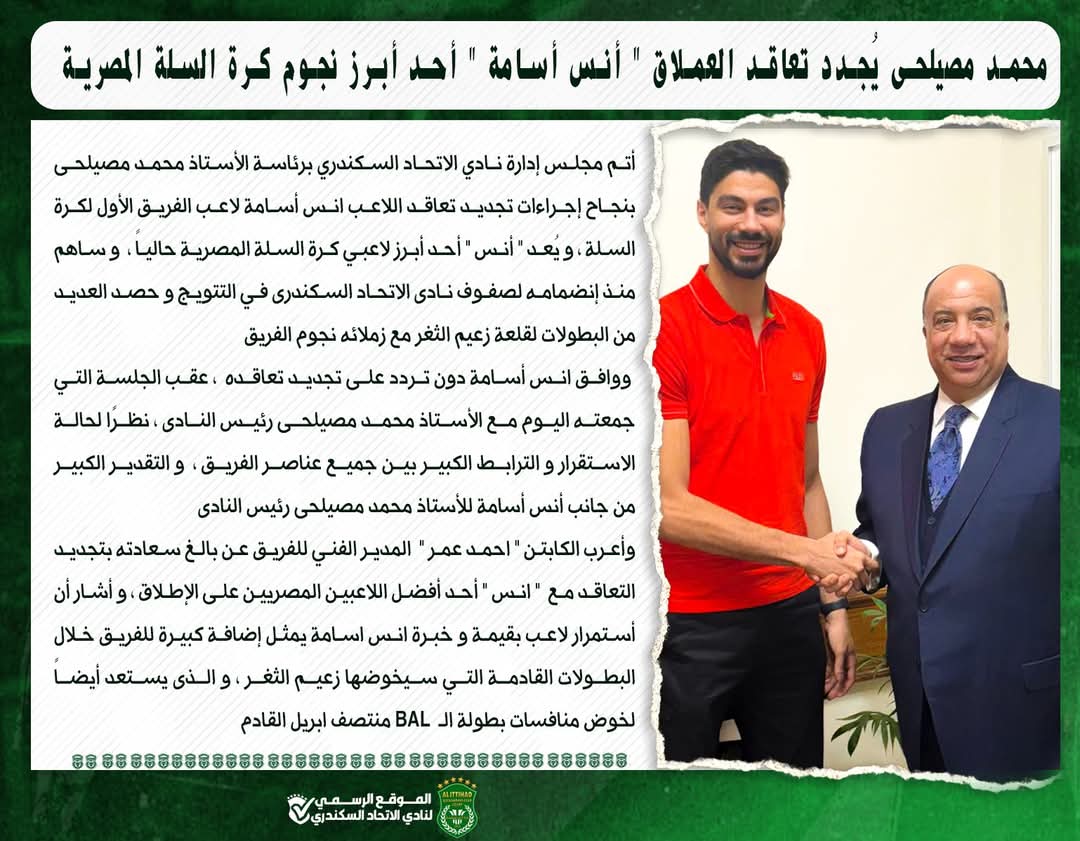 أعلن مجلس إدارة نادي الاتحاد السكندري، برئاسة محمد مصيلحي، نجاحه في تجديد عقد نجم الفريق الأول لكرة السلة أنس أسامة.