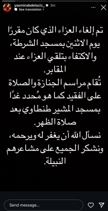 وقالت ياسمين عبد العزيز، منشورًا عبر حسابها الشخصي بموقع إنستجرام: تم إلغاء العزاء الذي كان مقررا يوم الاثنين بمسجد الشرطة، والاكتفاء بتلقي العزاء عند المقابر.