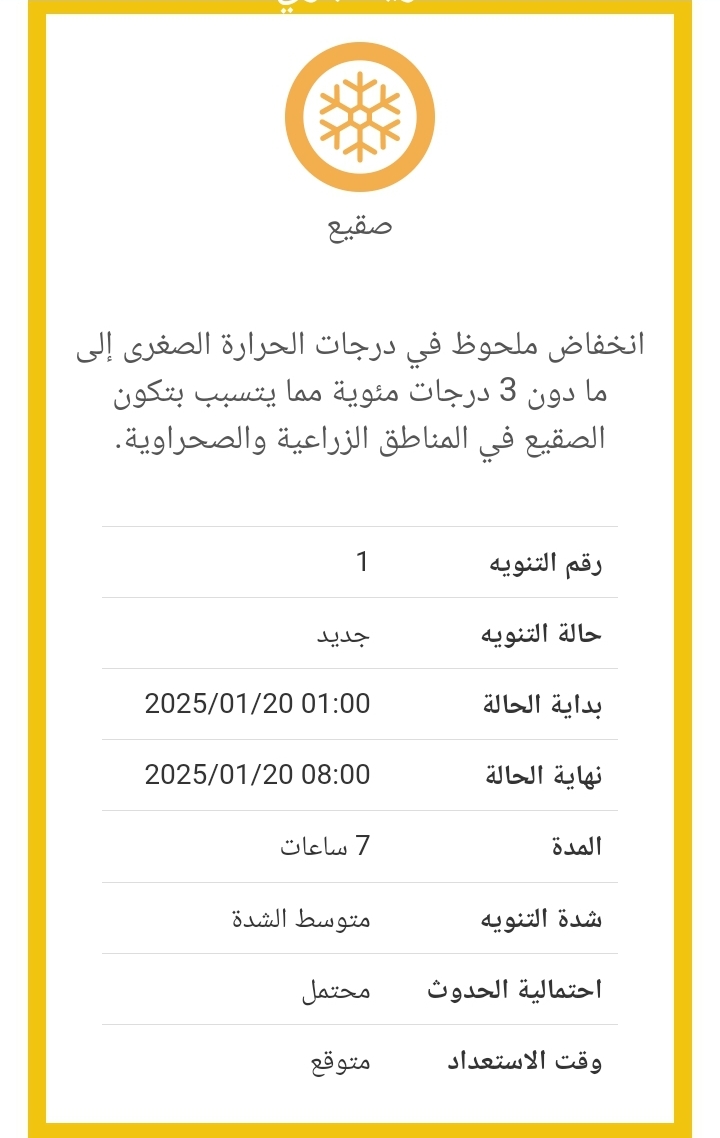 أما خلال الليل، فسيزداد الطقس برودة ليصبح باردًا إلى شديد البرودة، مع رياح متقلبة الاتجاه تتحول إلى شمالية غربية، بسرعة تتراوح بين 6 إلى 26 كيلومترًا في الساعة، مع ظهور بعض السحب المتفرقة وفرصة لتشكل الصقيع في المناطق الزراعية والصحراوية.