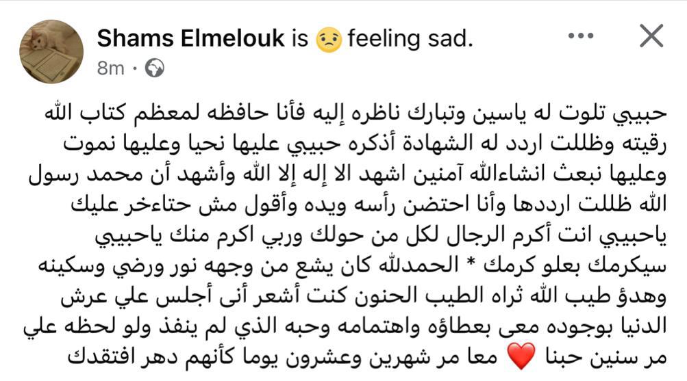 وكتبت شمس البارودي، منشورًا على حسابها الشخصي بموقع التواصل الاجتماعي فيسبوك، وقالت: حبيبي تلوت له ياسين وتبارك ناظره إليه فأنا حافظة لمعظم كتاب الله رقيته وظللت أردد له الشهادة أذكره حبيبي عليها نحيا وعليها نموت وعليها نبعث إن شاء الله آمنين، أشهد ألا إله إلا الله وأشهد أن محمد رسول الله ظللت أرددها وأنا احتضن رأسه ويده وأقول مش هتأخر عليك يا حبيبي.
