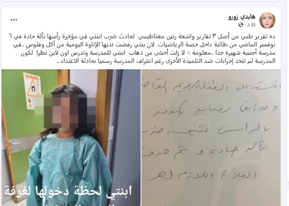 ونشرت الأم، في منشور لها، عبر صفحتها الشخصية بموقع التواصل الاجتماعي «فيس بوك»، تقريرًا طبيًا لحالة طفلتها بجانب صورتها لحظة دخولها لغرفة الرنين المغناطيسي، قائلة: ده تقرير طبي من أصل 3 تقارير وأشعة رنين مغناطيسي لحادث ضرب ابنتي في مؤخرة رأسها بآلة حادة في 6 نوفمبر الماضي من طالبة داخل حصة الرياضيات لأن بنتي رفضت تديها الإتاوة اليومية من أكل وفلوس.. في مدرسة أجنبية شهيرة جدا».