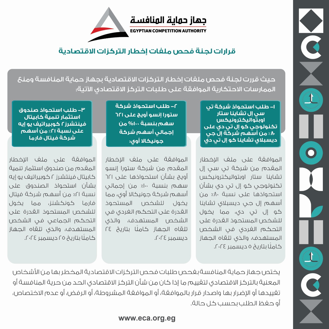 أقرت لجنة فحص ملفات إخطار التركزات الاقتصادية بجهاز حماية المنافسة ومنع الممارسات الاحتكارية الموافقة على طلبات التركز الاقتصادي الآتية:
