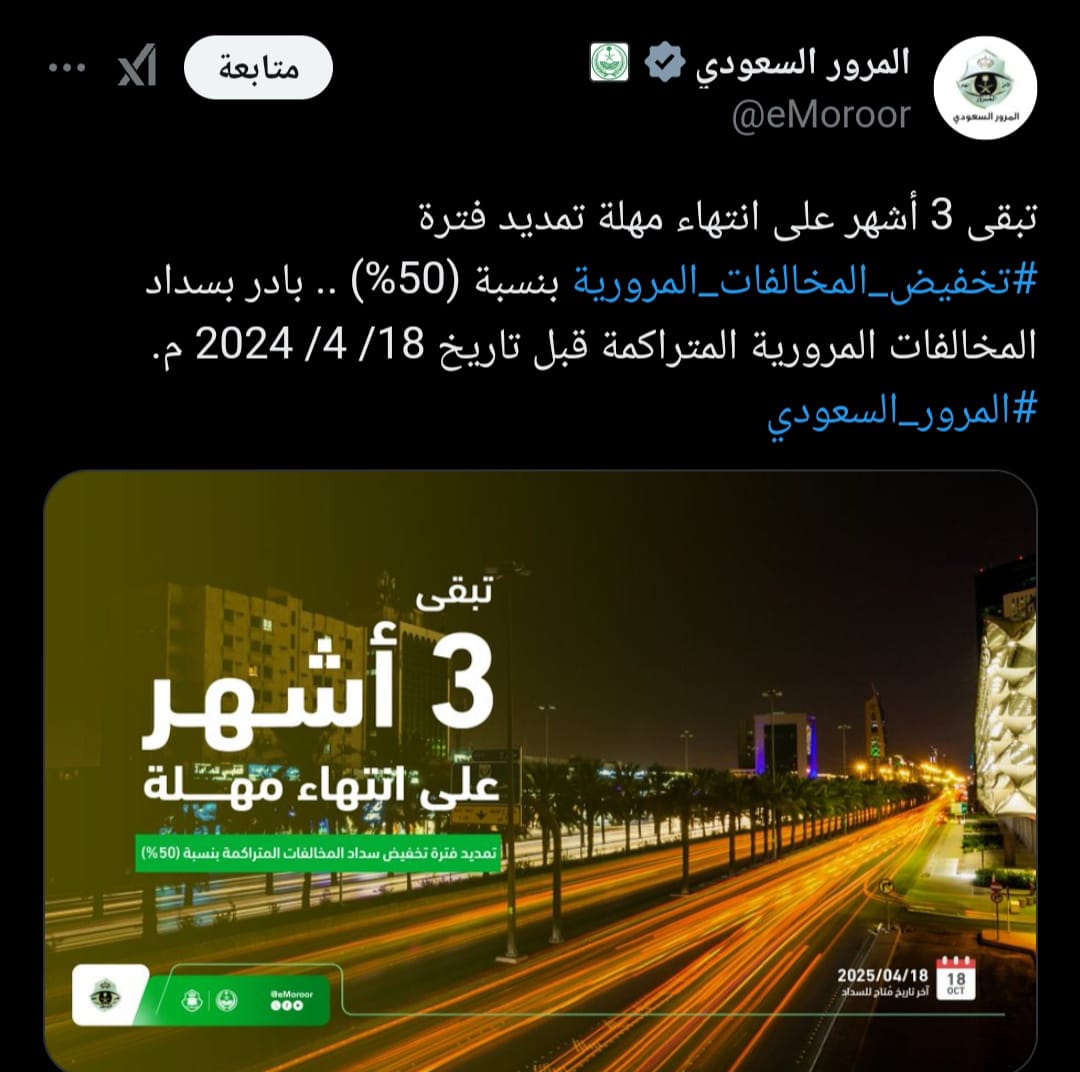 وقالت هيئة المرور السعودية على منصة إكس أن المبادرة مستمرة لمدة 3 أشهر على أن تنتهي في 19 أبريل 2025، وهذه المبادرة متاحة للمخالفات التي وقعت قبل تاريخ 18 أبريل 2024.