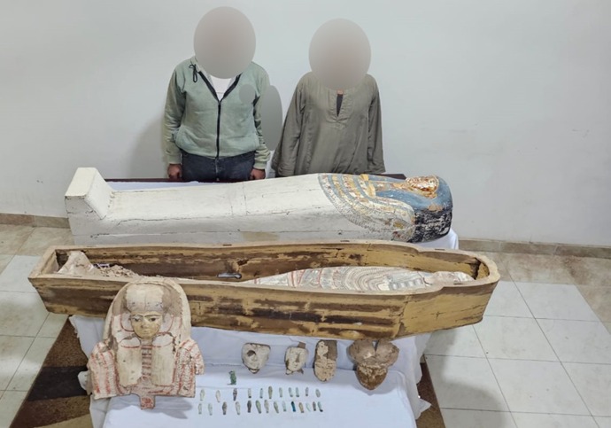 عقب تقنين الإجراءات تم استهدافهما وأمكن ضبطهما.. وبتفتيش المسكن عُثر على تابوت خشبى يظهر منه مومياء كاملة ملفوفة بالكارتوناج "الكتان" - تابوت خشبي مغلق - 4 وجوه خشبية تستخدم كوجوه للتوابيت – 26 تمثالا مختلف الأحجام "جميعها عليها رسومات ونقوش تعود للعصر الفرعوني".. وبمواجهتهما اعترفا بتنقيبهما عن الآثار وحيازتهما للقطع الأثرية بقصد الإتجار فيها.. وبعرض المضبوطات على مفتشى الآثار تبين أن جميع المضبوطات أثرية وتعود للعصر الفرعونى المتآخر، وتم اتخاذ الإجراءات القانونية.
