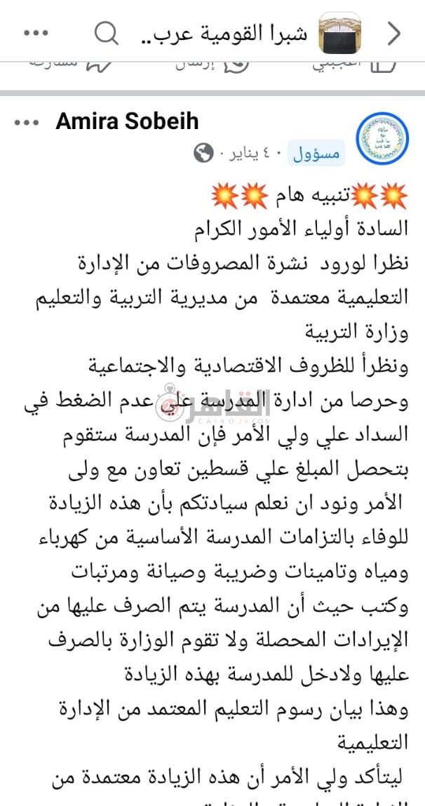 استغاثت مجموعة من أولياء أمور طلاب بـ مدرسة شبرا القومية للغات التابعة لإدارة الساحل التعليمية بمحافظة القاهرة، من زيادة المصروفات، وذلك قبل انطلاق الفصل الدراسي الثاني.