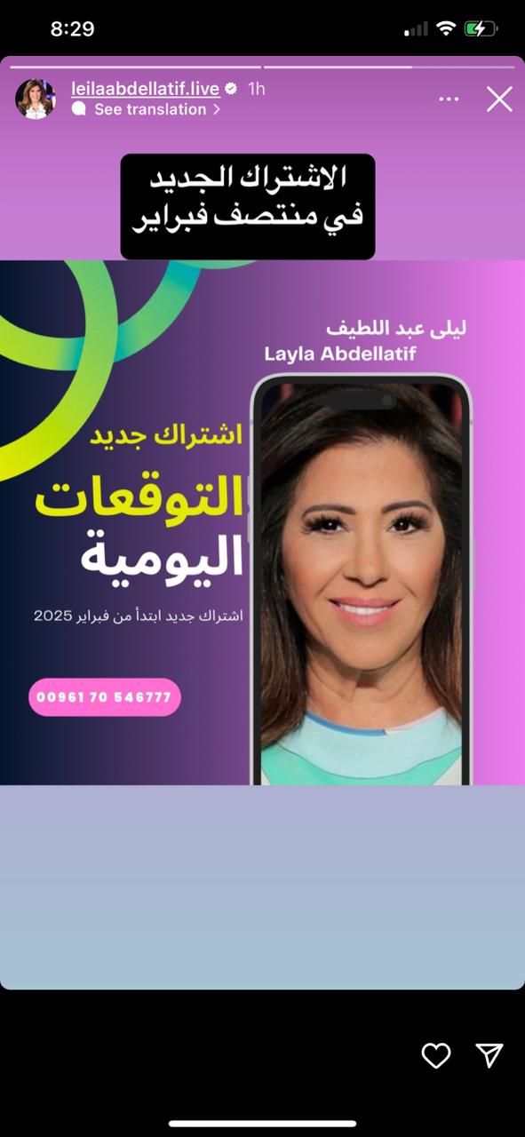 وحسب ما نشرته ليلى عبد اللطيف عبر إستوري حسابها الرسمي على منصة تداول الصور والفيديوهات إنستجرام، أعلنت إطلاق تطبيق بـ اسمها للكشف عن التوقعات اليومية لها، وذلك مقابل اشتراك جديد عبر رقم الهاتف الخاص بها.