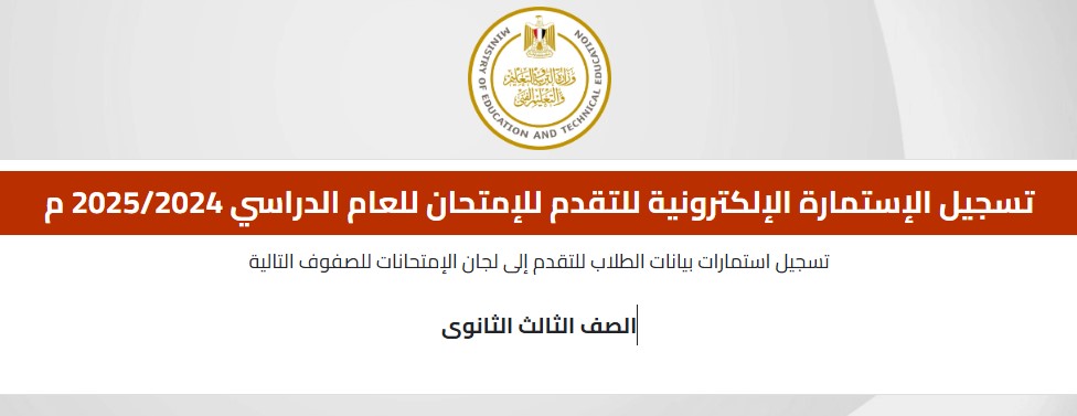 أعلنت وزارة التربية والتعليم والتعليم الفني، رابط تسجيل استمارة الثانوية العامة 2025، للتقدم لامتحانات الثانوية العامة 2025، للصف الثالث الثانوي والتي يتم تحريرها إلكترونيا على موقع وزارة التربية والتعليم وحفظ البيانات وطباعتها.