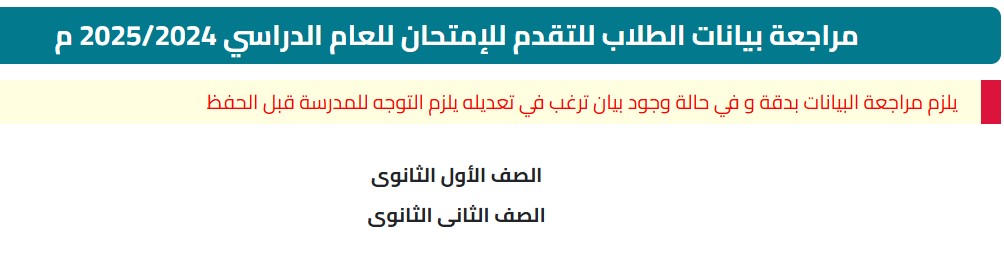 ويجب أن يسلم الطالب استمارة الثانوية العامة الإلكترونية بكافة مشتملاتها بعد طباعتها من الموقع الالكتروني للعام الدراسي 2024 / 2025 إلى مسئول شئون الطلبة بالمدرسة طبقا لما سجله إلكترونيا مع الأوراق التالية: