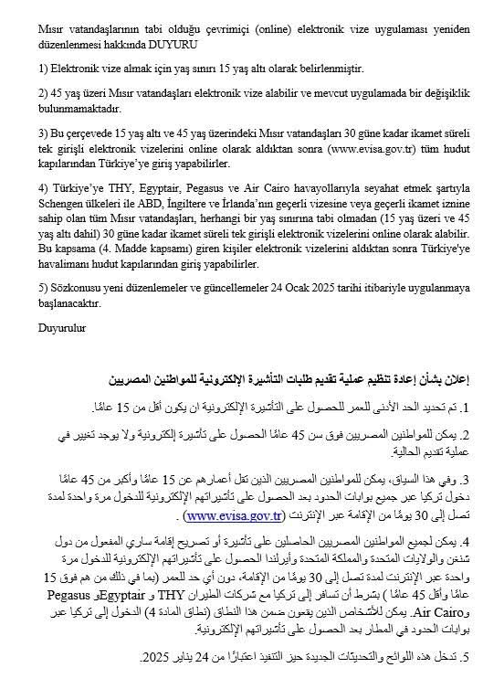 وبحسب البيان، يمكن لجميع المواطنين المصريين الحاصلين على تأشيرة أو تصريح إقامة ساري المفعول من دول شنجن والولايات المتحدة والمملكة المتحدة وأيرلندا الحصول على تأشيراتهم الإلكترونية للدخول مرة واحدة عبر الإنترنت لمدة تصل إلى 30 يوما من الإقامة، دون أي حد للعمر -بما في ذلك من هم فوق 15 عاما وأقل 45 عاما- بشرط أن السفر إلى تركيا على متن طائرات شركات الطيران THY وEgyptair وPegasus وAir Cairo.