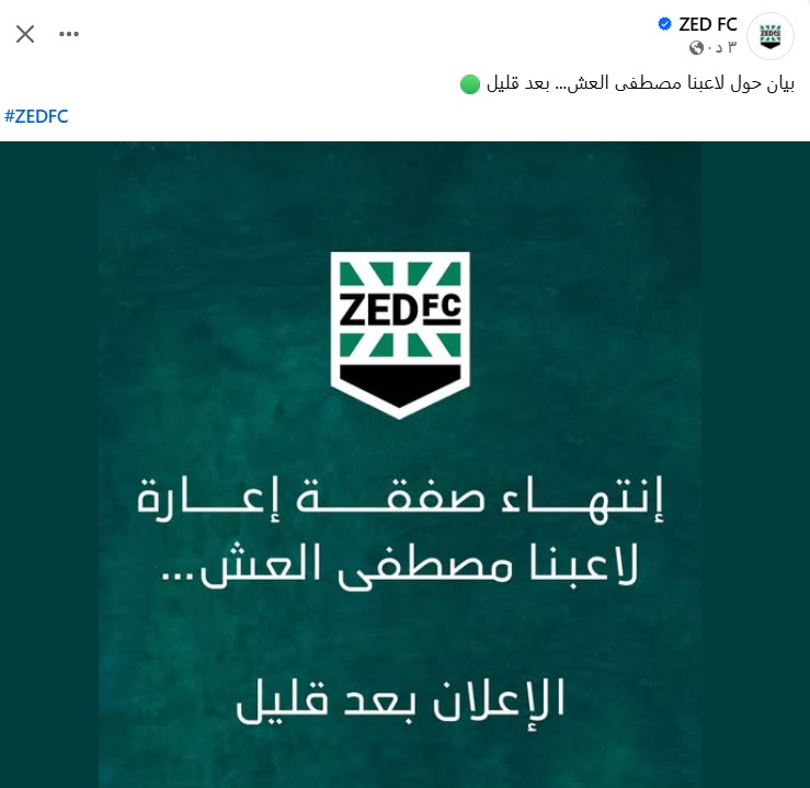 نشرت الصفحة الرسمية لنادي زد أف سي عبر فيس بوك، إتمام اتفاق إعارة اللاعب مصطفى العش، خلال موسم الانتقالات الشتوية.