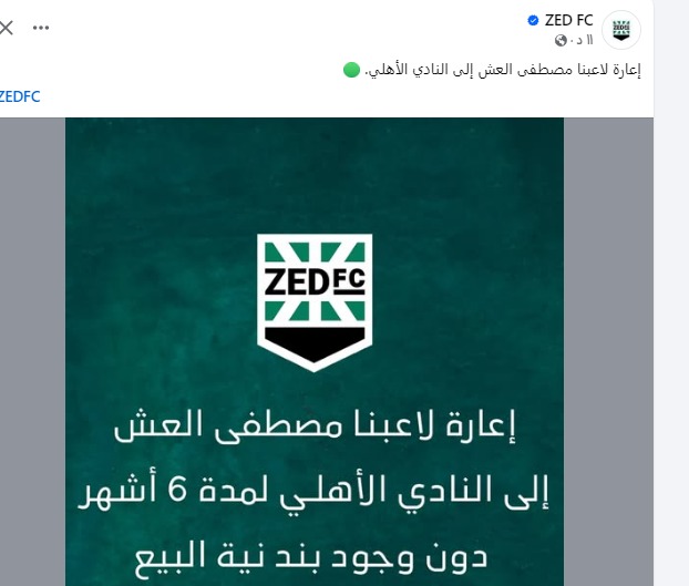 أعلن نادي زد إف سي، انتقال لاعبه مصطفى العش إلى صفوف النادي الأهلي، خلال فترة الانتقالات الشتوية الجارية على سبيل الإعارة لمدة 6 أشهر دون وجود بند في عقده بنية البيع.