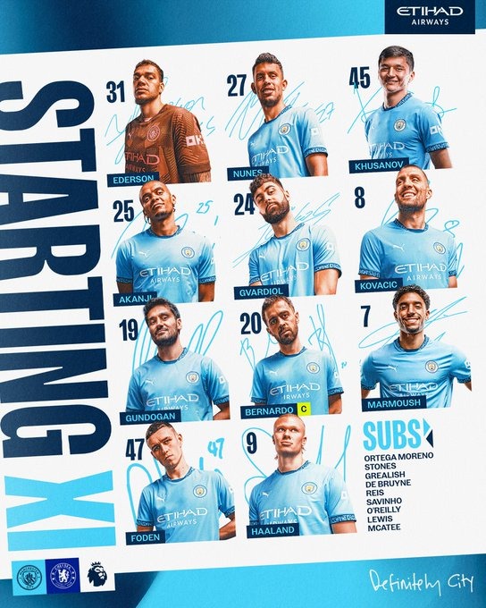 جاء تشكيل مانشستر سيتي الرسمي لمواجهة نظيره فريق تشيلسي في إطار الدوري الإنجليزي الممتاز، كالتالي: -