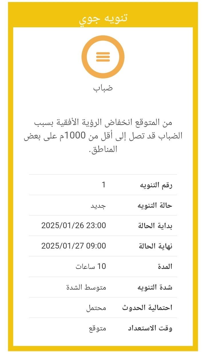 وحذرت الأرصاد من انخفاض الرؤية الأفقية بسبب الضباب، حيث قد تصل الرؤية إلى أقل من 1000 متر في بعض المناطق من الساعة 11 مساءً وحتى الساعة 9 صباحًا من يوم غدٍ الاثنين، لمدة 10 ساعات متواصلة.