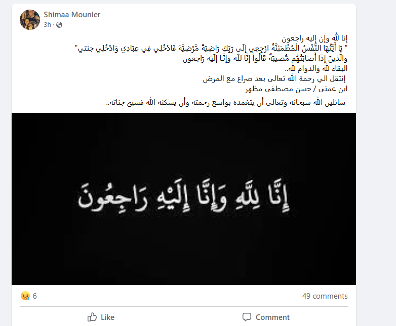 وكتب أحد أفراد أسرة الفنان حسن مصطفى مظهر عبر حسابه الشخصي بموقع التواصل الاجتماعي فيسبوك: إنا لله وإنا إليه راجعون.. يَا أَيَّتُهَا النَّفْسُ الْمُطْمَئِنَّةُ ارْجِعِي إِلَى رَبِّكِ رَاضِيَةً مَّرْضِيَّة فَادْخُلِي فِي عِبَادِي وَادْخُلِي جنتي والَّذِينَ إِذَا أَصَابَتْهُم مُّصِيبَةٌ قَالُواْ إِنَّا لِلّهِ وَإِنَّـا إِلَيْهِ رَاجعون.. البقاء لله والدوام لله.. انتقل إلى رحمة الله تعالى بعد صراع مع المرض ابن عمتي حسن مصطفى مظهر سائلين الله سبحانه وتعالى أن يتغمده بواسع رحمته وأن يسكنه الله فسيح جناته.