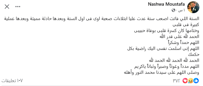 وكتبت نشوى مصطفى منشورًا عبر حسابها الشخصي على موقع التواصل الاجتماعي فيسبوك، قالت فيه: "السنة اللي فاتت كانت أصعب سنة عدت عليا، ابتلاءات صعبة جدًا في أول السنة، وبعدها حادثة مميتة، ثم عملية كبيرة في قلبي، وختامها كان كسرة قلبي بوفاة حبيبي.. الحمد لله على قدر الله، اللهم حمدًا وشكرًا، اللهم إني سلمت نفسي إليك راضيةً بكل حكمك، الحمد لله، الحمد لله، الحمد لله، اللهم مددًا وغوثًا وصبرًا وثباتًا يا كريم، وصل اللهم على سيدنا محمد النور وأهله."
