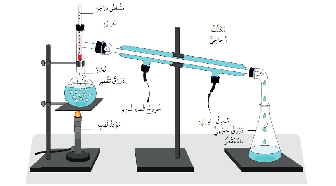 - التقطير البسيط: يستخدم التقطير البسيط لفصل مكونات المخلوط بعمليتي التبخير والتكرير، وذلك اعتمادا على الاختلاف الكبير في درجتي غليانهما، وتحلية المياه هي أفضل تجربة عملية للتقطير البسيط.