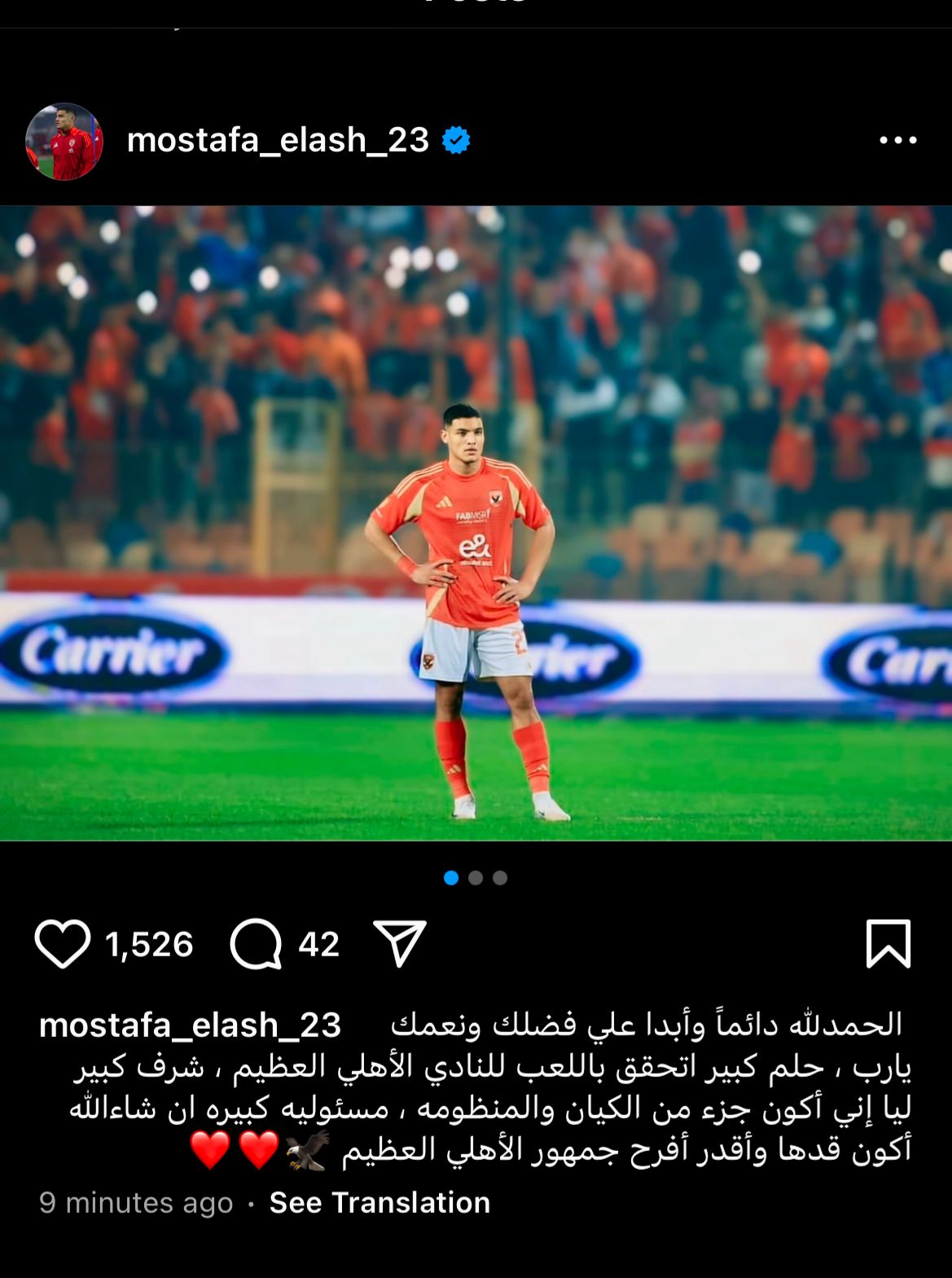 وكتب العش على حسابه الشخصي عبر موقع التواصل الاجتماعي إنستجرام: الحمد لله دائمًا وأبدا علي فضلك ونعمك يارب، حلم كبير اتحقق باللعب للنادي الأهلي العظيم، شرف كبير ليا إني أكون جزء من الكيان والمنظومة، مسئوليه كبيرة ان شاء الله أكون قدها وأقدر أفرح جمهور الأهلي العظيم.