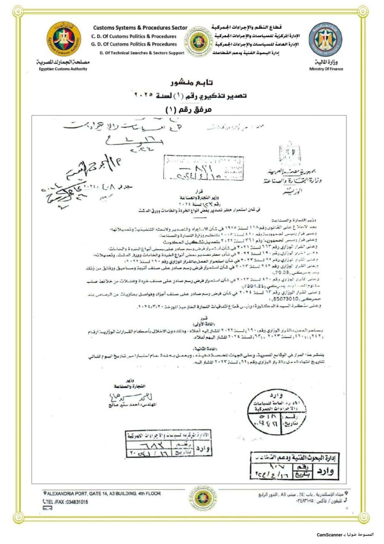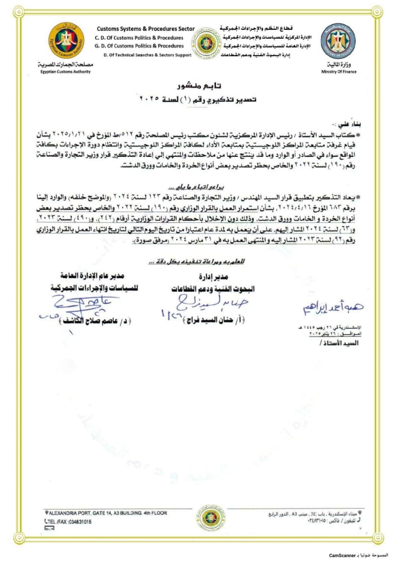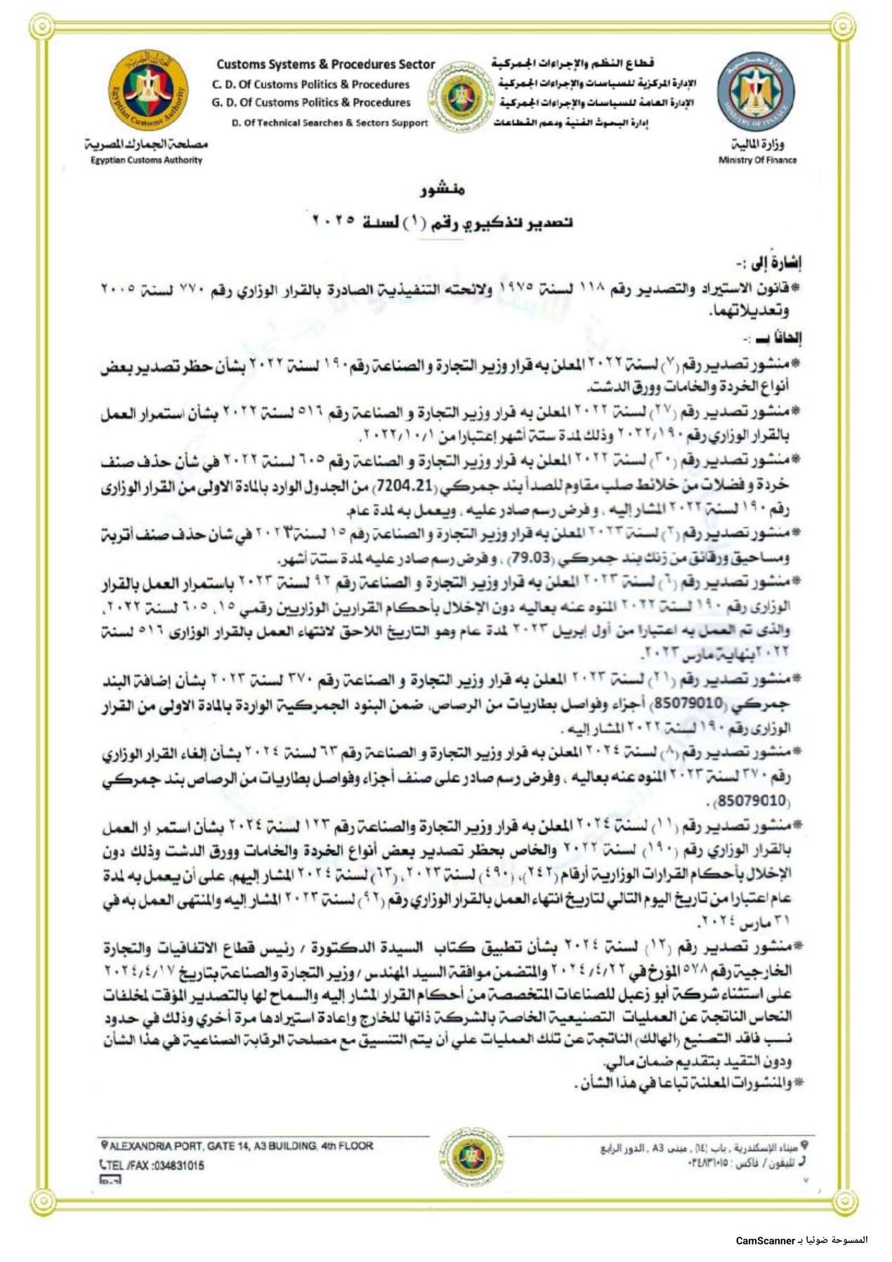 وجاء ذلك في سياق منشور تصدير تذكيري رقم 1 لسنة 2025 بخصوص إعادة التذكير بتطبيق قرار المهندس وزير التجارة حسن الخطيب، رقم 123 لسنة 2024 والموضح خلفه والوارد إلى الجمارك برقم 683 المؤرخ 2024/4/16، بشأن استمرار العمل بالقرار الوزاري رقم 190 لسنة 2022 والخاص بحظر تصدير بعض أنواع الخردة والخامات وورق الدشت وذلك دون الإخلال بأحكام القرارات الوزارية أرقام 242، و490 لسنة 2023 و63 لسنة 2024 المشار إليهم على أن يعمل به لمدة عام اعتبارا من تاريخ اليوم التالي لتاريخ انتهاء العمل بالقرار الوزاري رقم 92 لسنة 2013 المشار إليه والمنتهي العمل به في 31 مارس 2024 مرفق صورة.