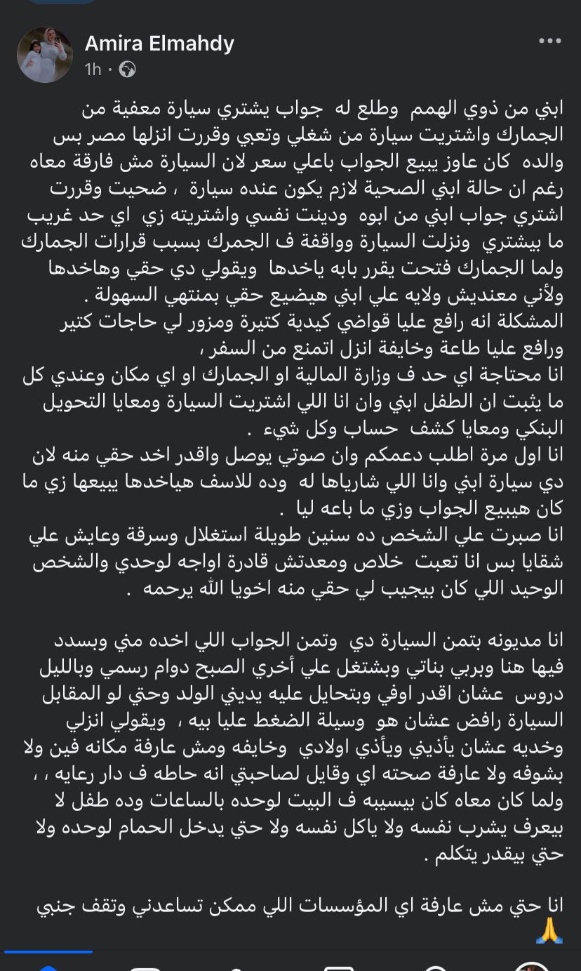 وواصلت أميرة المهدي: المشكلة إنه رافع عليا قواضي كيدية كثيرة ورافع عليا طاعة وخايفة أنزل أتمنع من السفر، أنا محتاجة أي حد في وزارة المالية أو الجمارك أو أي مكان، وعندي كل ما يثبت أن الطفل ابني وإن أنا اللي اشتريت السيارة، ومعايا التحويل البنكي ومعايا كشف حساب، أنا أول مرة أطلب دعمكم وأن صوتي يوصل وأقدر آخد حقي منه، لأن دي سيارة ابني وأنا اللي شارياها له، وده للأسف هياخدها يبيعها زي ما كان هيبيع الجواب وزي ما باعه ليا.