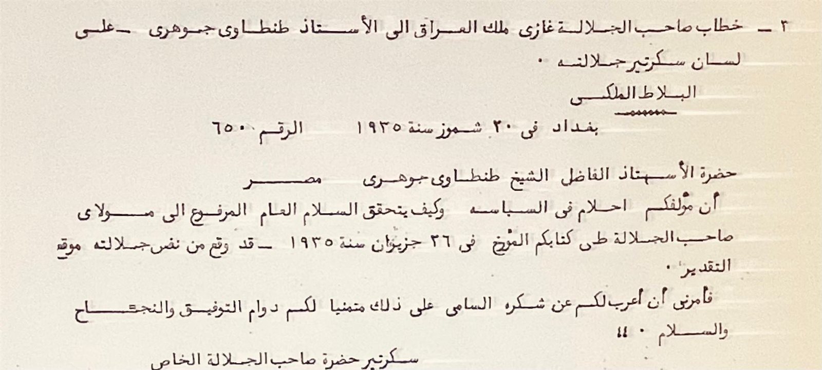 يعرض متحف المخطوطات بجناح الأزهر بمعرض القاهرة الدولي للكتاب، وثيقة نادرة للعالِم الأزهري طنطاوي جوهري، من ملك العراق للشيخ طنطاوي يوجه له الشكر على كتابه عن السلام، جاء فيها: حضرة الأستاذ الفاضل الشيخ طنطاوي جوهري إن مؤلفكم أحلام في السياسة وكيف يتحقق السلام العام المرفوع قد وقع من نفسه موقع التقدير.