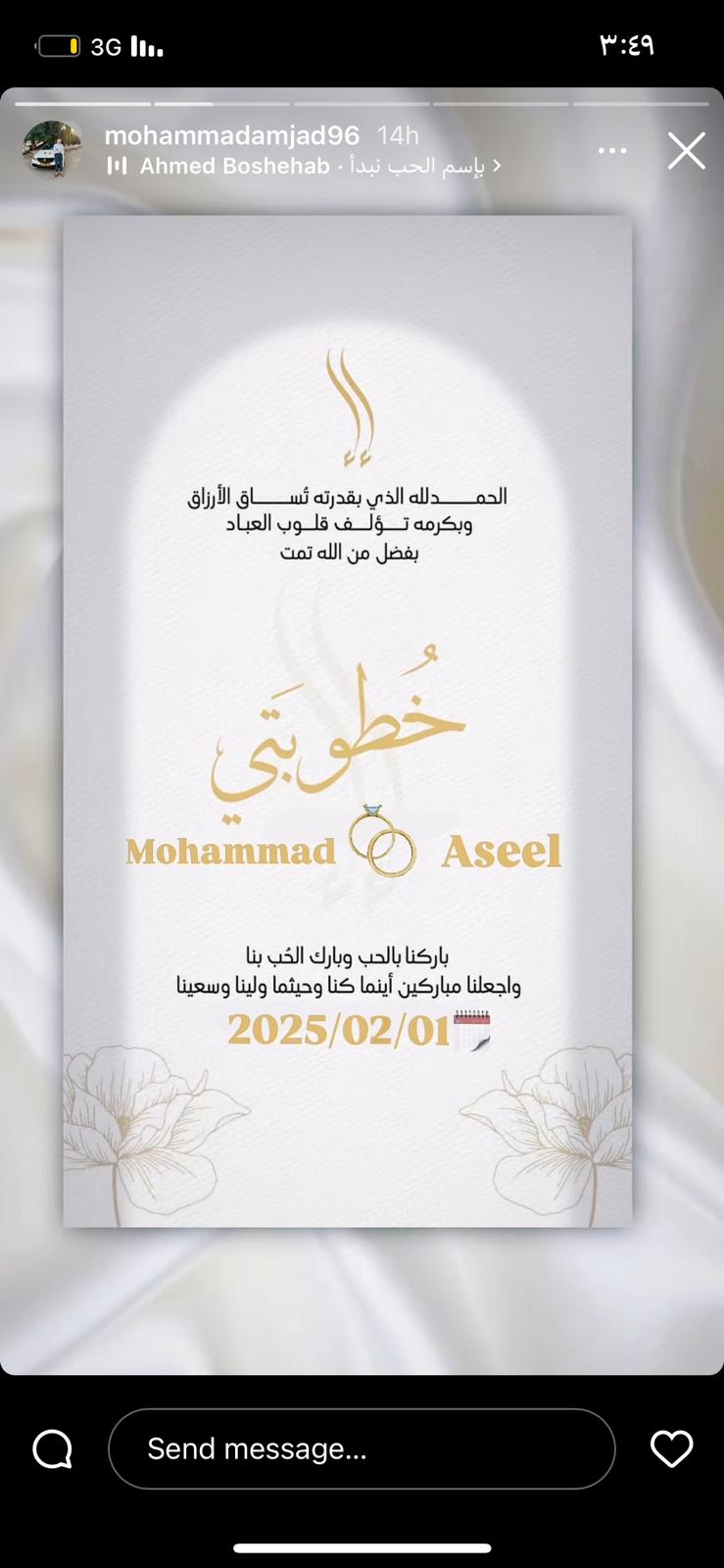 وتداول رواد مواقع التواصل الاجتماعي منشورا لـ الشهيد محمد أمجد حدوش، والذي أعلن فيها عن خطوبته، معربا عن مدى فرحته بذلك ليستشهد اليوم بعد يوم واحد من خطوبته.