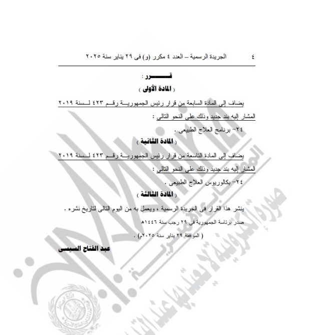 وقالت الجريدة الرسمية، إن المادة الأولى من القرار تضمنت بأن يضاف إلى المادة السابعة من قرار رئيس الجمهورية رقم 423 لسنة 2019 المشار إليه، بند جديد وذلك على النحو التالي: برنامج العلاج الطبيعي، مشيرة إلى أن المادة الثانية من قرار تشمل: إضافة بكالوريوس العلاج الطبيعي.