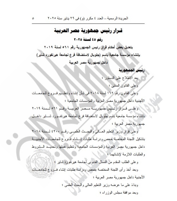 وجاء ذلك بعد الاطلاع على الدستور وعلى القانون المدني، وعلى القانون رقم 162 لسنة 2018 في شأن إنشاء وتنظيم فروع للجامعات الأجنبية داخل جمهورية مصر العربية والمؤسسات الجامعية، وعلى قرار رئيس الجمهورية لاستضافة فرع لجامعة كوفنتري داخل مصر، وعلى قرار وزير التعليم العالي بتشكيل اللجنة المختصة بفحص ودراسة طلبات إنشاء فروع للجامعات الأجنبية داخل جمهورية مصر العربية.