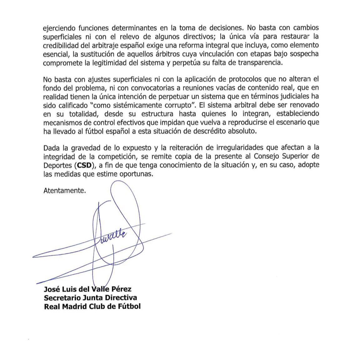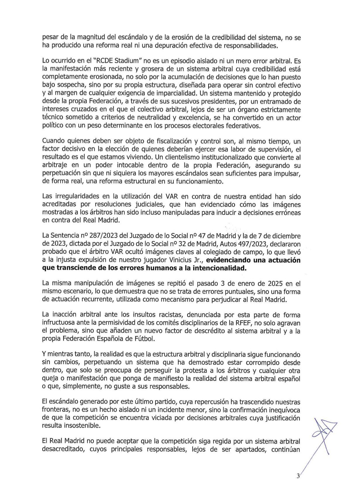 وقال نادي ريال مدريد في شكواه المقدمة لـ الاتحاد الإسباني لكرة القدم والمجلس الأعلى لـ الرياضة: يقدم نادي ريال مدريد احتجاجًا رسميًا إلى الاتحاد الإسباني لكرة القدم بشأن الأداء التحكيمي الفاضح، بما في ذلك قرارات الـVAR، خلال المباراة التي أقيمت في 1 فبراير 2025 ضد إسبانيول.
