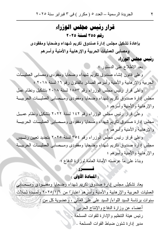 نص قرار رئيس الوزراء، على الآتي: يعاد تشكيل مجلس إدارة صندوق تكريم شهداء وضحايا ومفقودي ومصابي