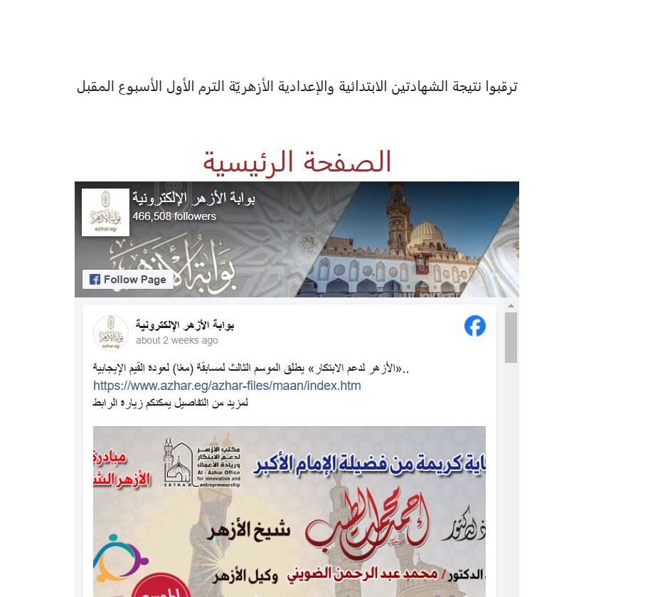 - الدخول على الصفحة الرئيسية الخاصة بالبوابة: تظهر العديد من الأيقونات، ستجد عبارة في الأعلى (ترقبوا نتيجة الشهادة الابتدائية والإعدادية الترم الأول الأسبوع المقبل عبر natiga.azhar.eg)، قم بالضغط عليها، لتتوجه إلى صفحة أخرى.