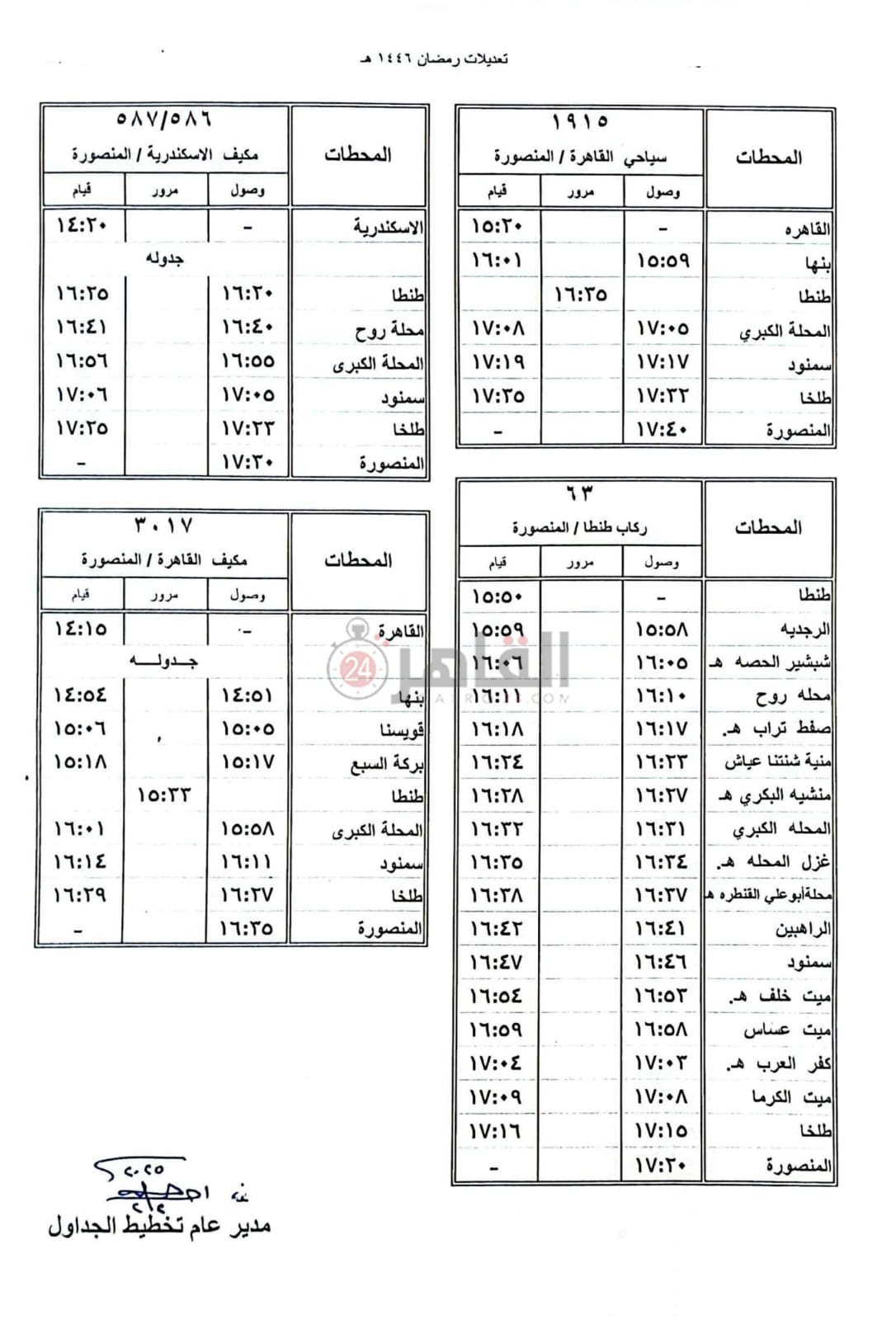 ثانيًا: قيام قطار 1915 سياحي (القاهرة / المنصورة) من القاهرة الساعة 15:20 عصرًا ليصل المنصورة الساعة 17:40 مساءً كالجدول المرفق.