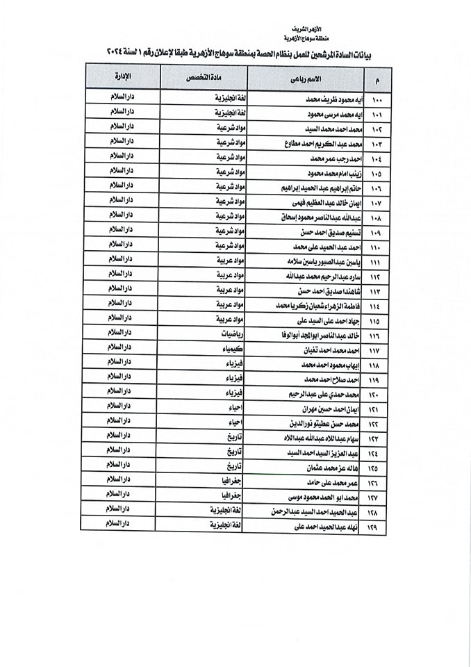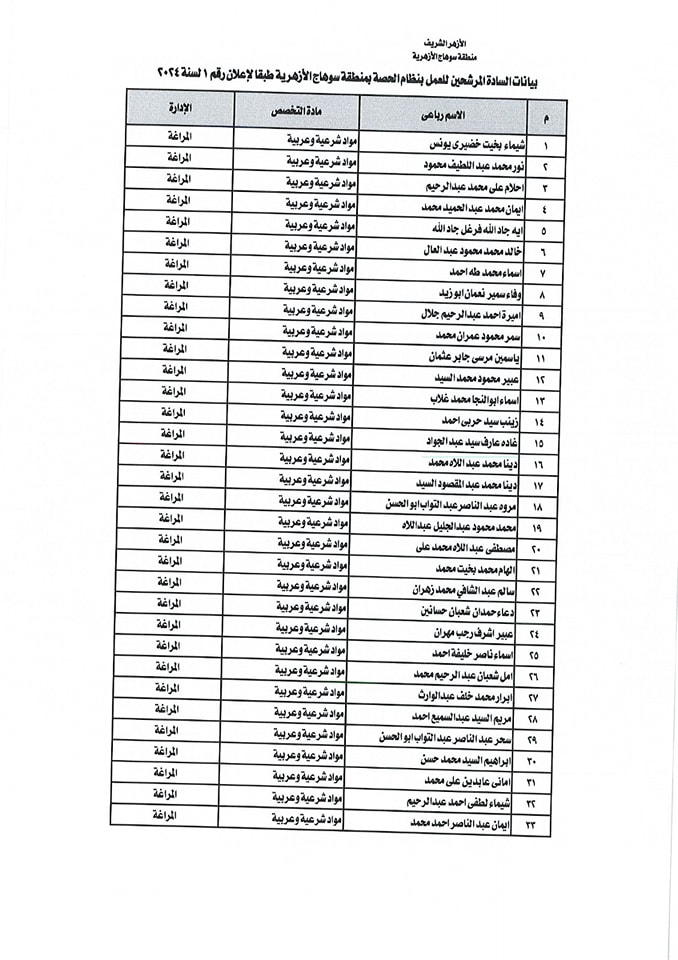 ننشر أسماء المقبولين في مسابقة معلمي الحصة بمنطقة سوهاج الأزهرية