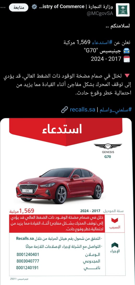 أعلنت وزارة التجارة السعودية على حسابها الرسمي على منصة إكس، استدعاء 1569 نسخة من جينيسيس G70 موديل 2017 - 2024.