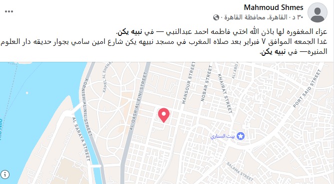 وحرص محمود شميس على نعي شقيقته، عبر حسابه الشخصي بموقع فيسبوك، وكتب منشورًا جاء فيه: بقلوب مؤمنة بقضاء الله وقدره، أنعى أختي الغالية فاطمة أحمد محمود عبدالنبي التي انتقلت إلى رحمة الله تعالى.