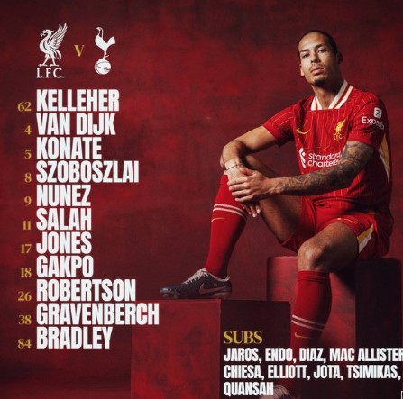وأعلن المدرب الهولندي آرني سلوت، المدير الفني لفريق ليفربول عن التشكيل الرسمي الذي سيخوض به مباراة توتنهام في كأس الكاراباو، والذي جاء على الشكل التالي:ـ