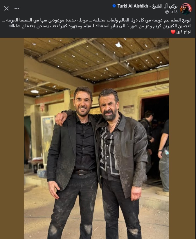 ونشر تركي آل الشيخ الصورة عبر حسابه الشخصي بموقع فيسبوك، وعلق عليها قائلًا: أتوقع الفيلم يتم عرضه في كل دول العالم ولغات مختلفة، مرحلة جديدة موعودين فيها في السينما العربية، النجمين الكبيرين كريم وعز من شهر 6 إلى يناير استعداد للفيلم ومجهود كبير! تعب يستحق بعده أن شاء الله نجاح كبير.
