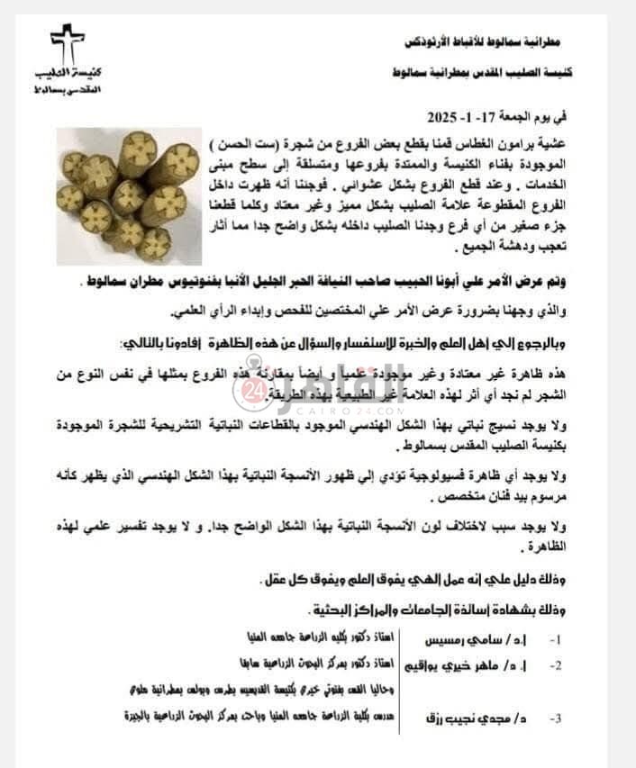 واستطردت: ولا يوجد نسيج نباتي بهذا الشكل الهندسي الموجود بالقطاعات النباتية التشريحية للشجرة الموجودة بكنيسة الصليب المقدس بسمالوط، ولا يوجد أي ظاهرة فسيولوجية تؤدي إلى ظهور الأنسجة النباتية بهذا الشكل الهندسي الذي يظهر كانه مرسوم بيد فنان متخصص، ولا يوجد سبب لاختلاف لون الأنسجة النباتية بهذا الشكل الواضح جدا ولا يوجد تفسير علمي لهذه الظاهرة.
