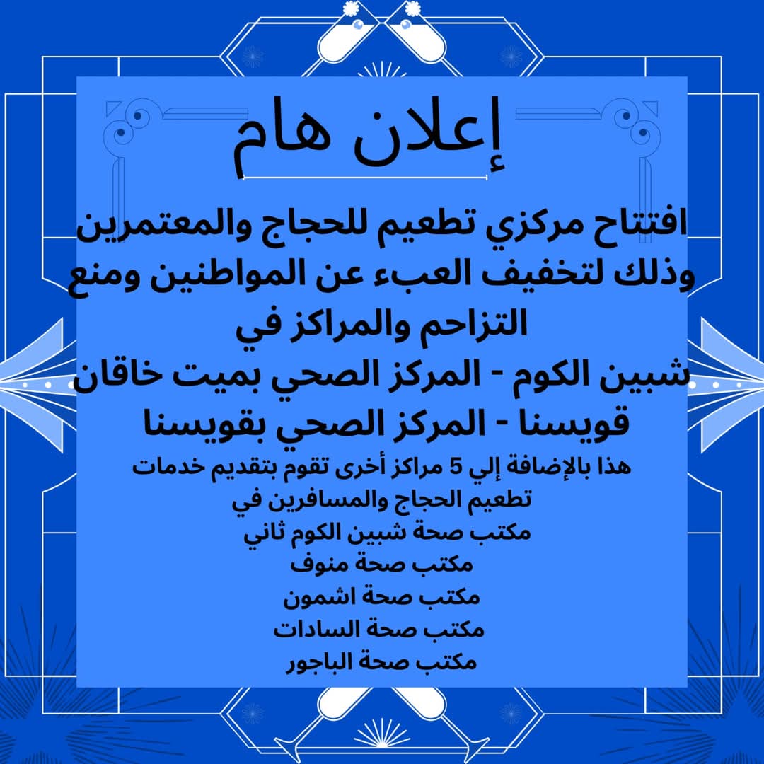 أعلنت مديرية الصحة بمحافظة المنوفية عن افتتاح مركزين جديدين لتقديم خدمات تطعيم الحجاج والمعتمرين. تم تخصيص المركز الصحي بميت خاقان بمدينة شبين الكوم، والمركز الصحي بقويسنا، لتقديم التطعيمات اللازمة للحجاج والمعتمرين استعدادًا لموسم الحج.