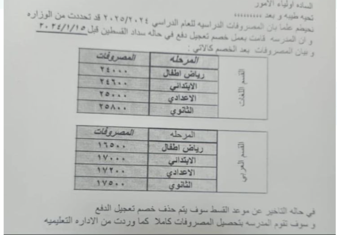مدرسة لغات بالجيزة ترفع المصروفات المدرسية 32% واشتراك الباصات 110%