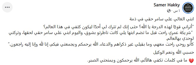 وكتب زوج إنجي مراد منشورًا، عبر حسابه الشخصي بموقع التواصل الاجتماعي فيس بوك، قائلًا: ابني الغالي علي سامر حقي في ذمة الله، أتراني قويًا لهذه الدرجة يا الله؟ حتى إنك لم تترك لي أحدًا ليكون كتفي في هذا العالم؟، شريكة عمري راحت قبل ما تضم ابنها يلي كانت ناطرتو بشوق، واليوم ابني علي سامر حقي لحقها، وتركني لوحدي بهذا العالم.