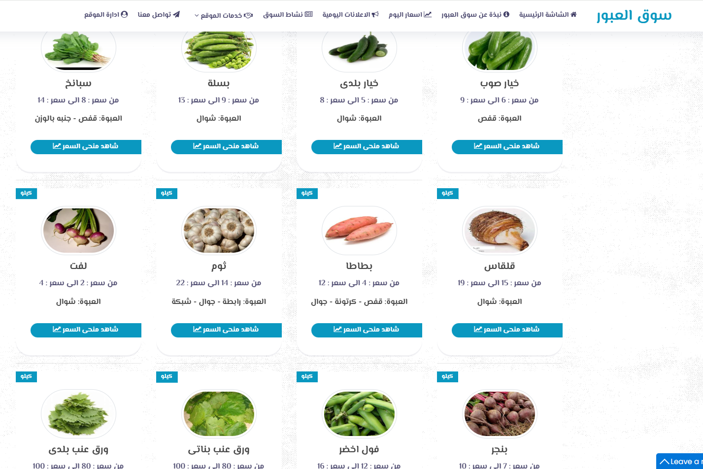 وجاء سعر كيلو القلقاس بسوق العبور بين 15 و19 جنيها، وسعر كيلو البطاطا بين 4 و12 جنيها، وسعر ورق العنب البلدي بين 80 و100 جنيه.
