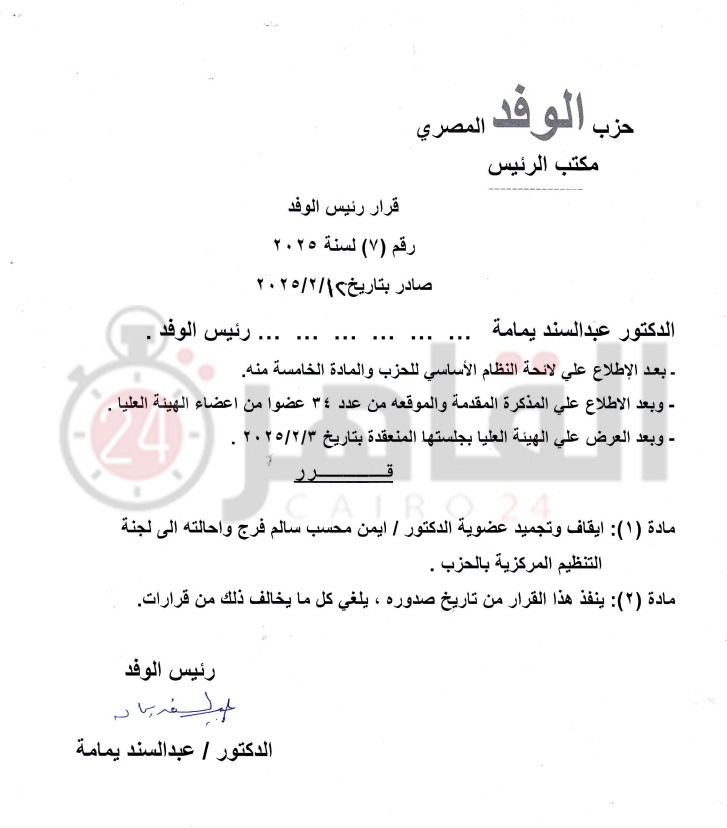 ونص القرار الذي حصل القاهرة 24 عليه، على إيقاف وتجميد عضوية الدكتور أيمن محسب وإحالته إلى لجنة التنظيم المركزية بالحزب.