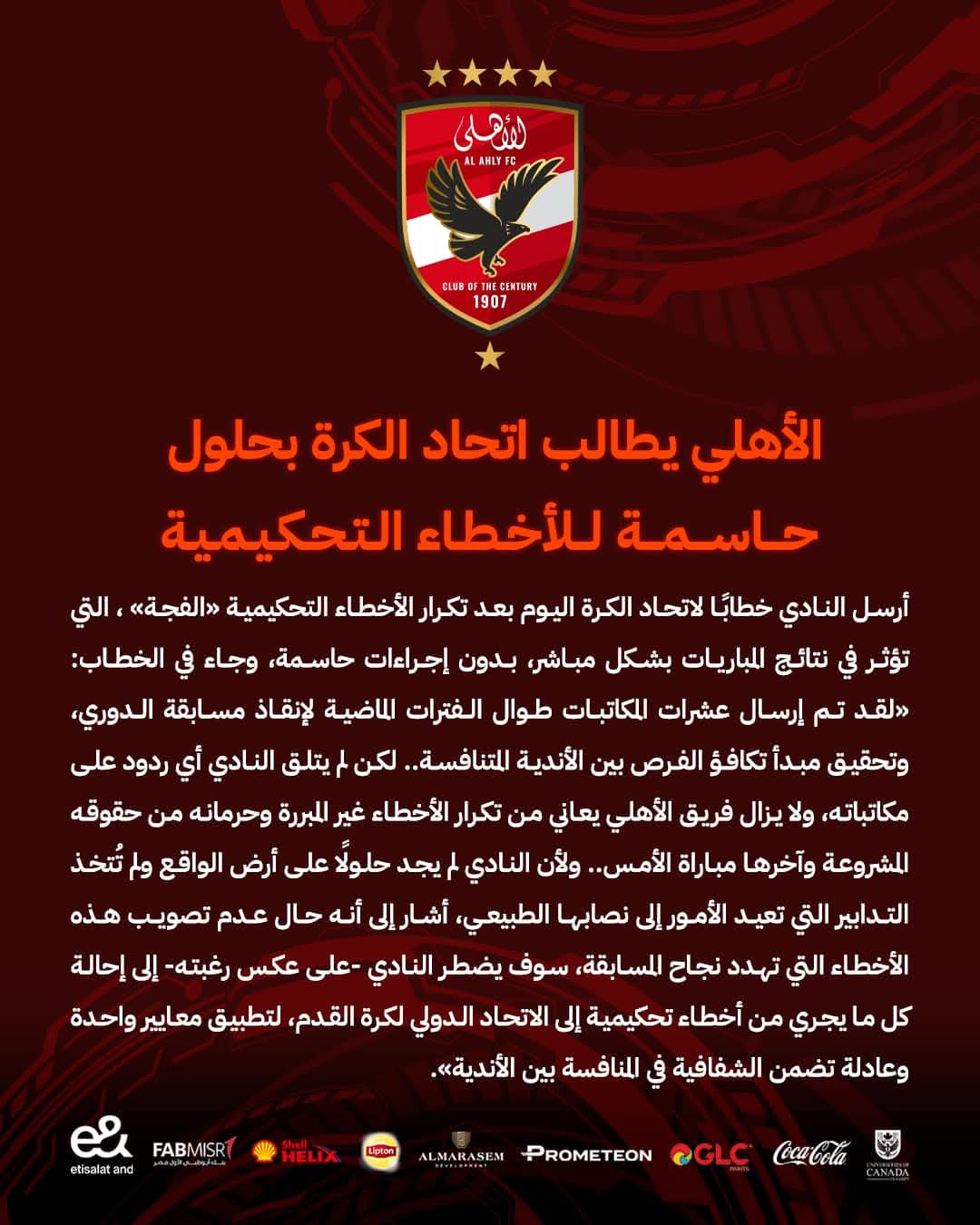 وجاء نص الخطاب كالتالي: لقد تم إرسال عشرات المكاتبات طوال الفترات الماضية لإنقاذ مسابقة الدوري، وتحقيق مبدأ تكافؤ الفرص بين الأندية المتنافسة.. لكن لم يتلق النادي أي ردود على مكاتباته، ولا يزال فريق الأهلي يعاني من تكرار الأخطاء غير المبررة وحرمانه من حقوقه المشروعة وآخرها مباراة الأمس.. ولأن النادي لم يجد حلولًا على أرض الواقع ولم تُتخذ التدابير التي تعيد الأمور إلى نصابها الطبيعي، أشار إلى أنه حال عدم تصويب هذه الأخطاء التي تهدد نجاح المسابقة، سوف يضطر النادي -على عكس رغبته- إلى إحالة كل ما يجري من أخطاء تحكيمية إلى الاتحاد الدولي لكرة القدم، لتطبيق معايير واحدة وعادلة تضمن الشفافية في المنافسة بين الأندية.
