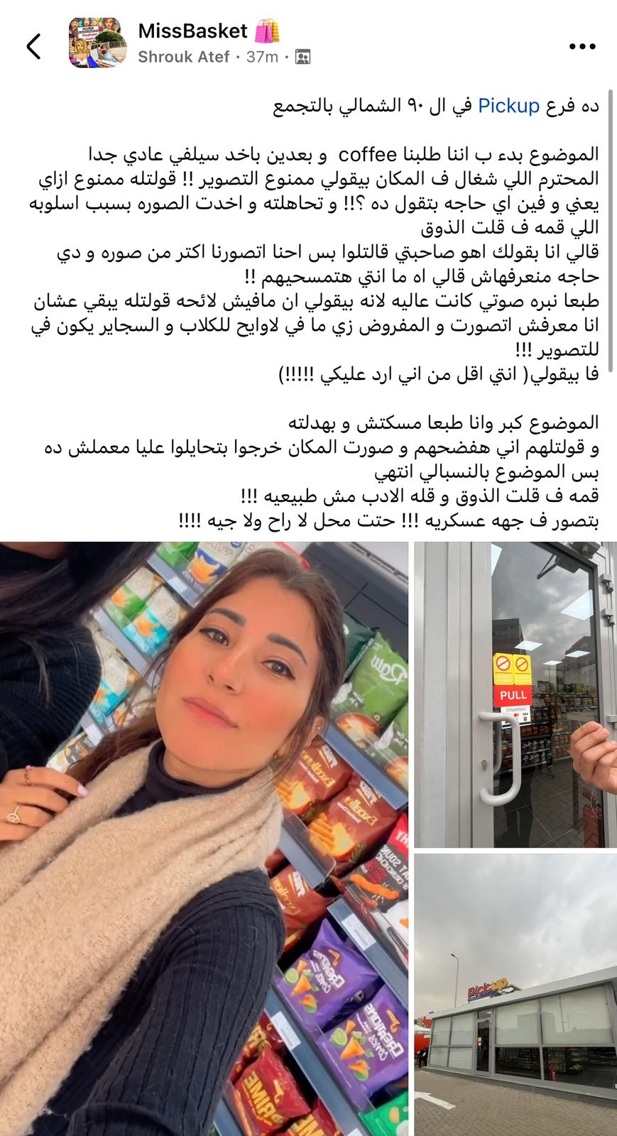 وتحدثت شروق عن تفاصيل المشكلة التي تعرضت لها، قائلة: طلبت قهوة من كافيه بالتجمع، وبعدين باخد سيلفي عادي جدًا، ولكن الموظف اللي شغال في الكافيه قالي ممنوع التصوير، فرديت عليه وقلتله التصوير ممنوع إزاي، وبعد كده تجاهلته وأخدت الصورة.