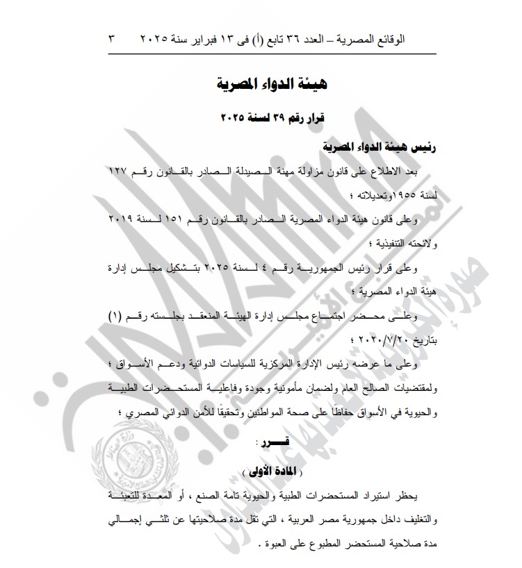 وجاء نص المادة الأولى من القرار كالتالي: يحظر استيراد المستحضرات الطبية والحيوية تامة الصنع، أو المعدة للتعبئة والتغليف داخل جمهورية مصر العربية، التي تقل مدة صلاحيتها عن ثلثي إجمالي مدة صلاحية المستحضر المطبوع على العبوة.