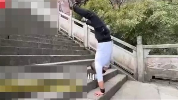 واستغرق صن خمس ساعات لتسلق 999 درجة من جبل تيانمن في تشانغ جياجيه بمقاطعة هونان بوسط الصين، في وضعية الوقوف على اليدين.