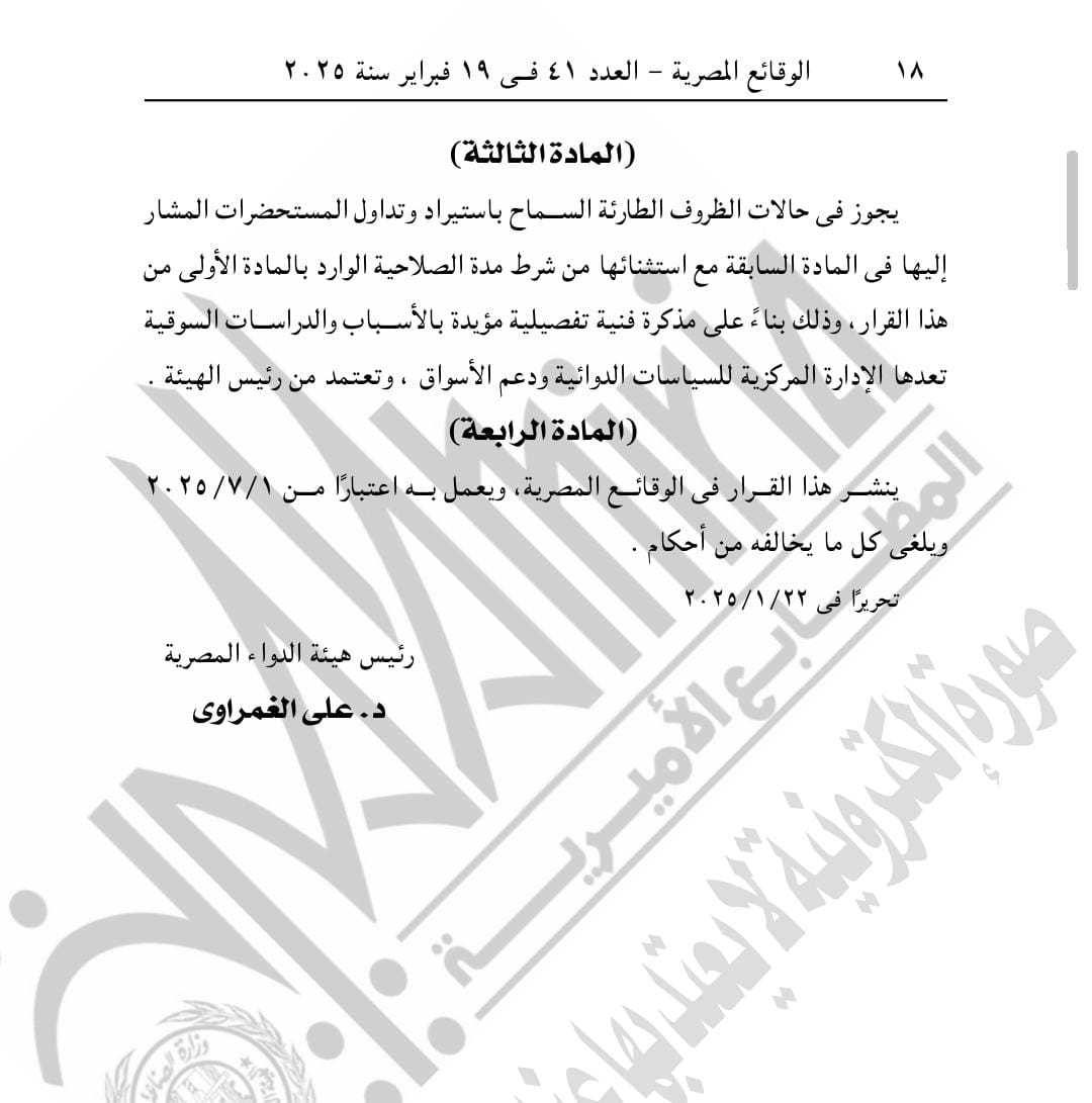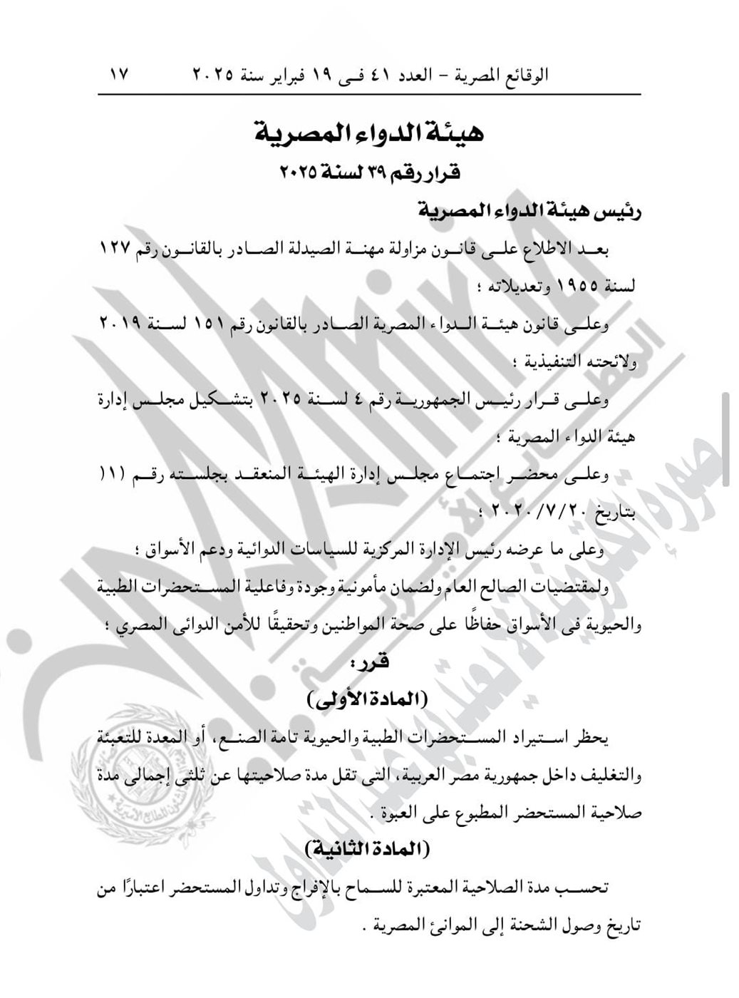 نشرت الجريدة الرسمية، قرار هيئة الدواء المصرية، رقم 39 لسنة 2025 بشأن حظر استيراد المستحضرات الطبية والحيوية تامة الصنع أو المعدة للتعبئة والتغليف داخل جمهورية مصر العربية.
