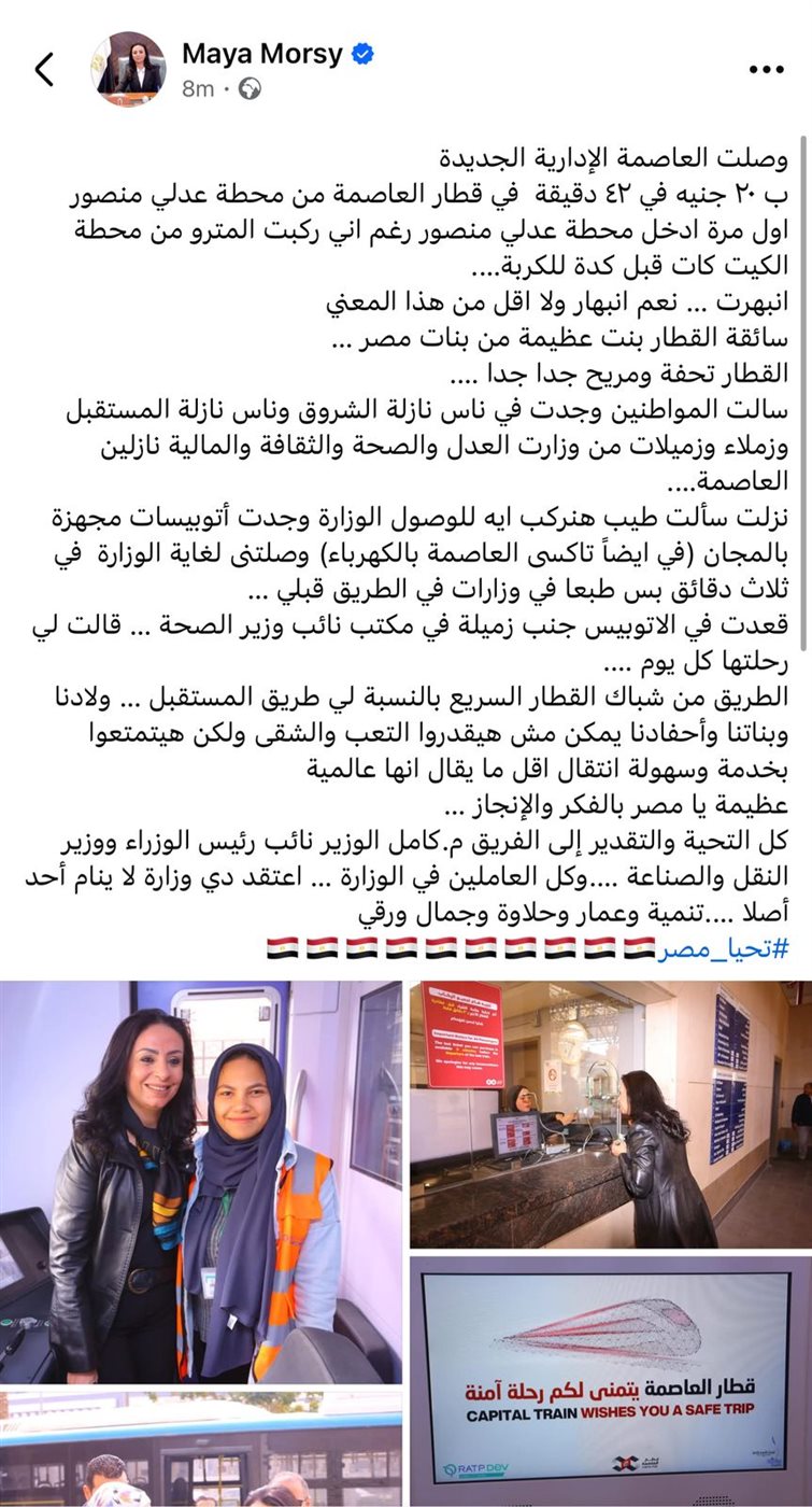 وقالت وزيرة التضامن الاجتماعي، في منشور لها عبر صفحتها الرسمية بموقع التواصل الاجتماعي «فيس بوك»، إنها وصلت إلى وصلت العاصمة الإدارية الجديدة بـ 20 جنيه في 42 دقيقة في قطار العاصمة من محطة عدلي منصور، مردفة: أول مرة ادخل محطة عدلي منصور رغم اني ركبت المترو من محطة الكيت كات قبل كدة للكربة.. انبهرت… نعم انبهار ولا اقل من هذا المعني، وسائقة القطار بنت عظيمة من بنات مصر، القطار تحفة ومريح جدا جدا ».