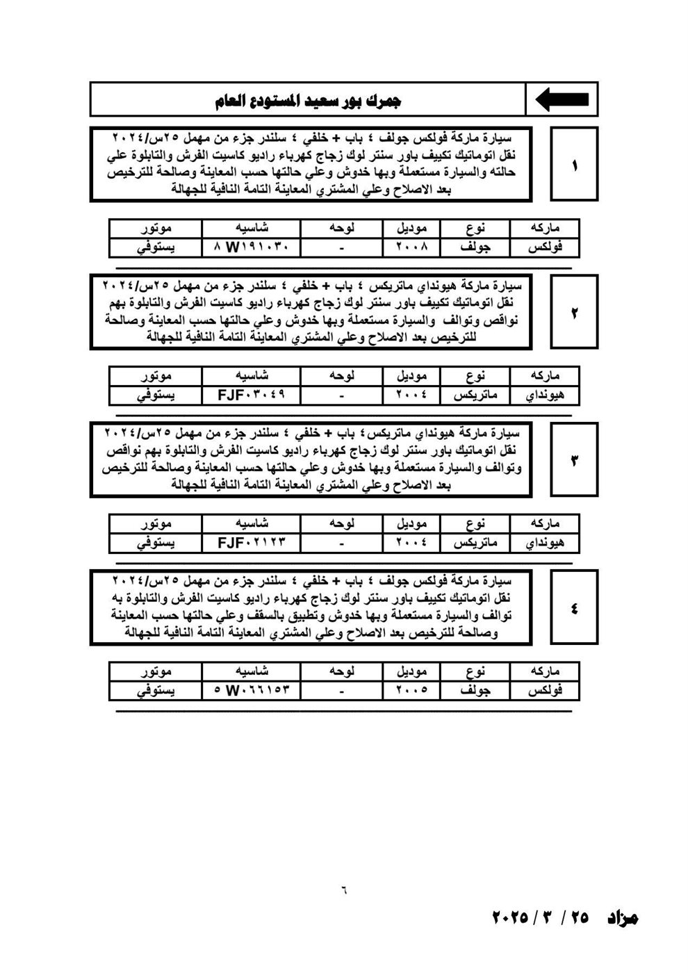 أعلنت مصلحة الجمارك عقد جلستي مزاد يوم 25 مارس 2025 لـ السيارات المخزنة بجمارك بورسعيد والإسكندرية، وتعقد فى الحادية عشرة ظهر الخميس 25 مارس 2025 بقاعة نادي الجيزة الرياضى شارع البحر الأعظم أسفل كوبري عباس بالجيزة، وذلك لبيع عدد من لوطات السيارات الواردة من الخارج والمخزنة بساحات ومخازن جمارك بورسعيد والإسكندرية.